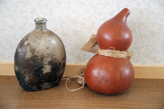 右が瓢箪、飲料を入れる。左は水筒。